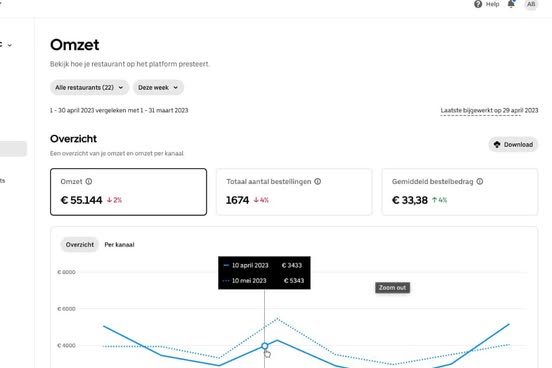 - Stap 3: het volgende scherm toont de prestaties van je restaurant, je kunt de periode wijzigen waarvan je de gegevens wilt bekijken.