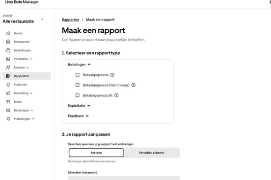 In rapporten kun je gedetailleerde rapporten downloaden over de betalingen, activiteiten en feedback van je restaurant.