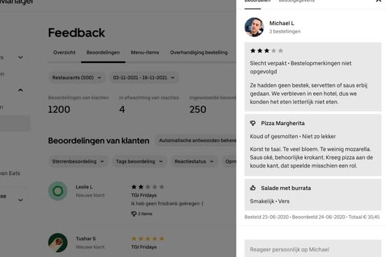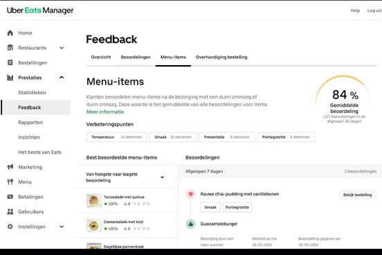 - Feedback: krijg een overzicht van de feedback van klanten over je eten en restaurant, en lees en reageer op beoordelingen van klanten.